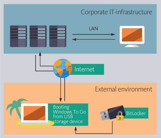 In corporate environment for Windows To Go IT-department uses operating system which is prepared by IT-specialists in advance relying on user’s needs and keeping all internal IT-policies of the company. That is, the employee receives completely centrally configured operating system on a portable USB-drive. He can use his private PC to work with it according to BYOD but in this case the company’s policies including IT-security policies are not broken.