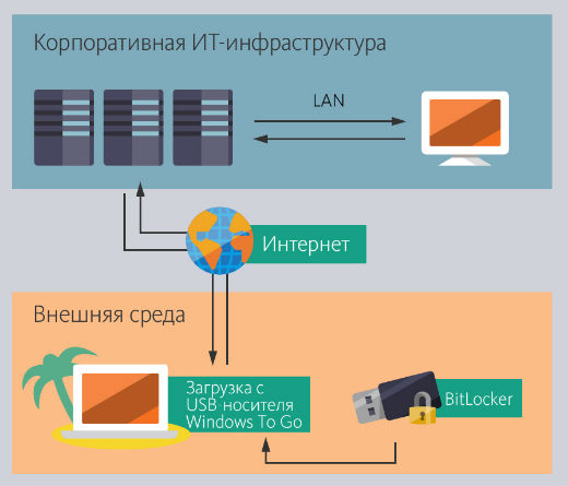 В корпоративной среде ИТ-отдел использует для Windows To Go операционную систему, которая подготавливается заранее ИТ-специалистами, исходя из потребностей работника и с соблюдением всех внутренних ИТ-политик компании. То есть, на переносном USB-носителе сотрудник получает полностью централизованно сконфигурированную операционную систему. Он может использовать для работы с ней свой личный ПК, согласно BYOD, но в этом случае не нарушаются политики компании, в том числе и политики ИТ-безопасности.